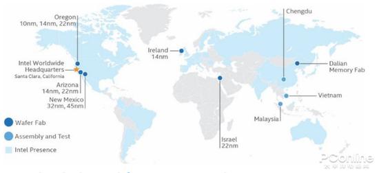 作為一家全球性的公司,英特爾除了在美國(guó)本土擁有半導(dǎo)體工廠之外,在全球各地也建立了大大小小的工廠,主要分布及工藝技術(shù)如下: